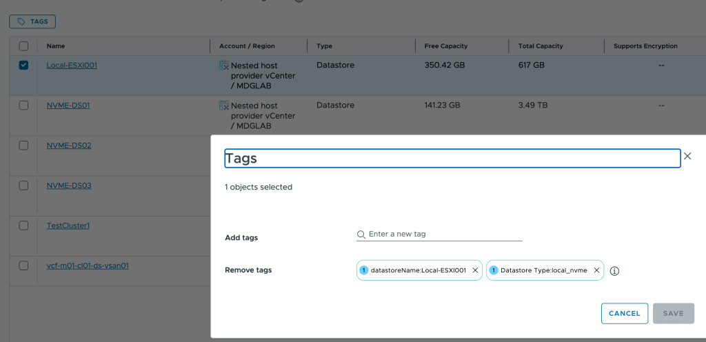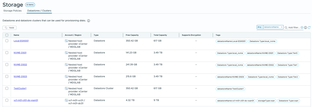 The tag prefix datastoreName: is an example only and we will see in the Orchestrator action that we can use the input parameter tagPrefix to specify this tag prefix. The important part is that the name of the datastore be the tag value.