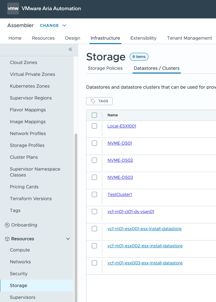 In Aria Automation Assembler, Infrastructure/Resources/Storage