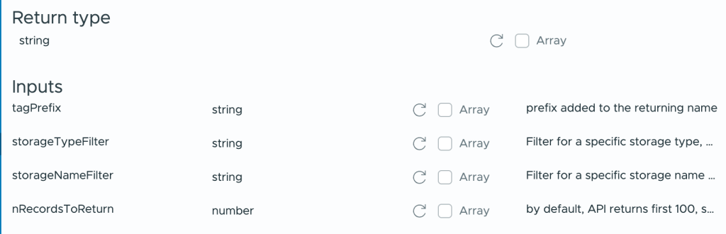 The action we are creating will have 4 inputs and 1 output and is called getDatastoreWithMostFreeSpace: