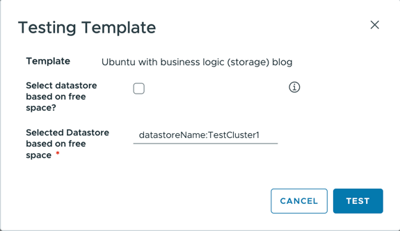 In this example, i will attempt to explain how an external action can be used to run some business logic in order to influence the placement of resources. In this case specifically, the external action will discover and identify the datastore clusters that have the most free space available. Obviously, this is just an example and the same logic could be used and applied for many use cases.
