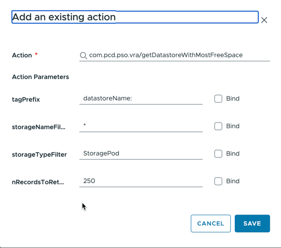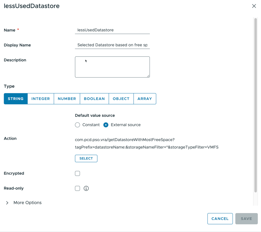 $dynamicDefault: /data/vro-actions/com.pcd.pso.vra/getDatastoreWithMostFreeSpace?tagPrefix=datastoreName:&storageNameFilter=*&storageTypeFilter=StoragePod&nRecordsToReturn=250